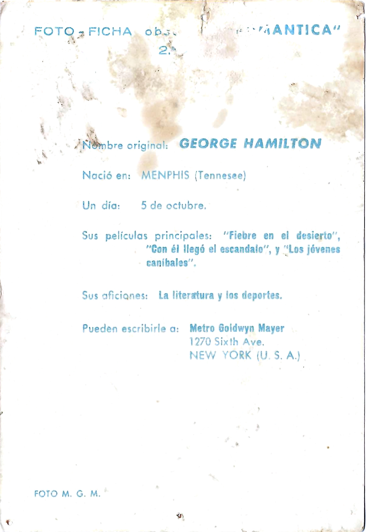 Postal a color de George Hamilton del año 1960. De la empresa Metro Goidwyn Mayer. Impreso en España.