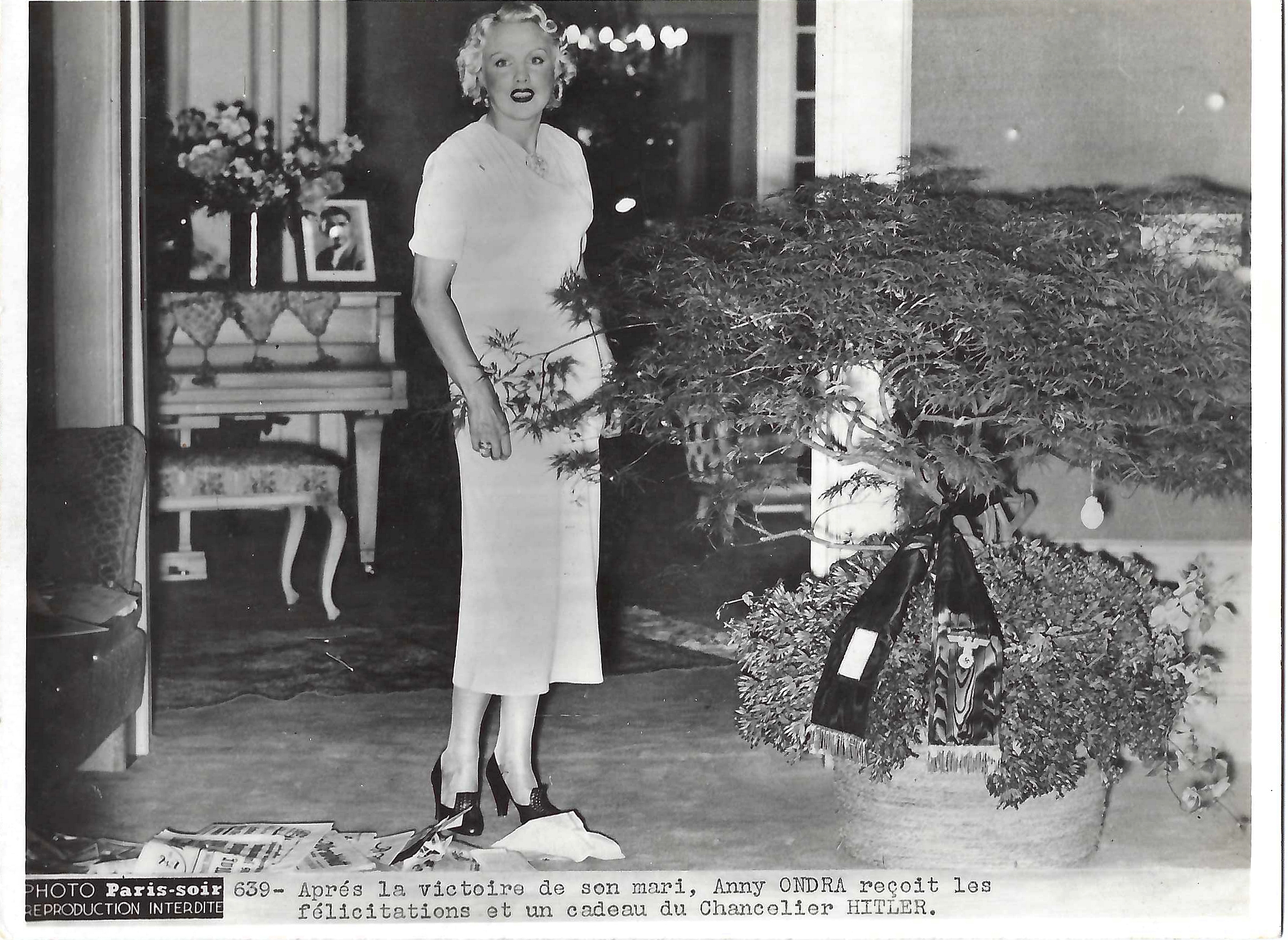 Fotografía en blanco y negro de un regalo que hizo el canciller Hitler a la mujer de un soldado en agradecimiento por la victoria, año 1939. De la empresa Paris-soir. Está escrito en francés