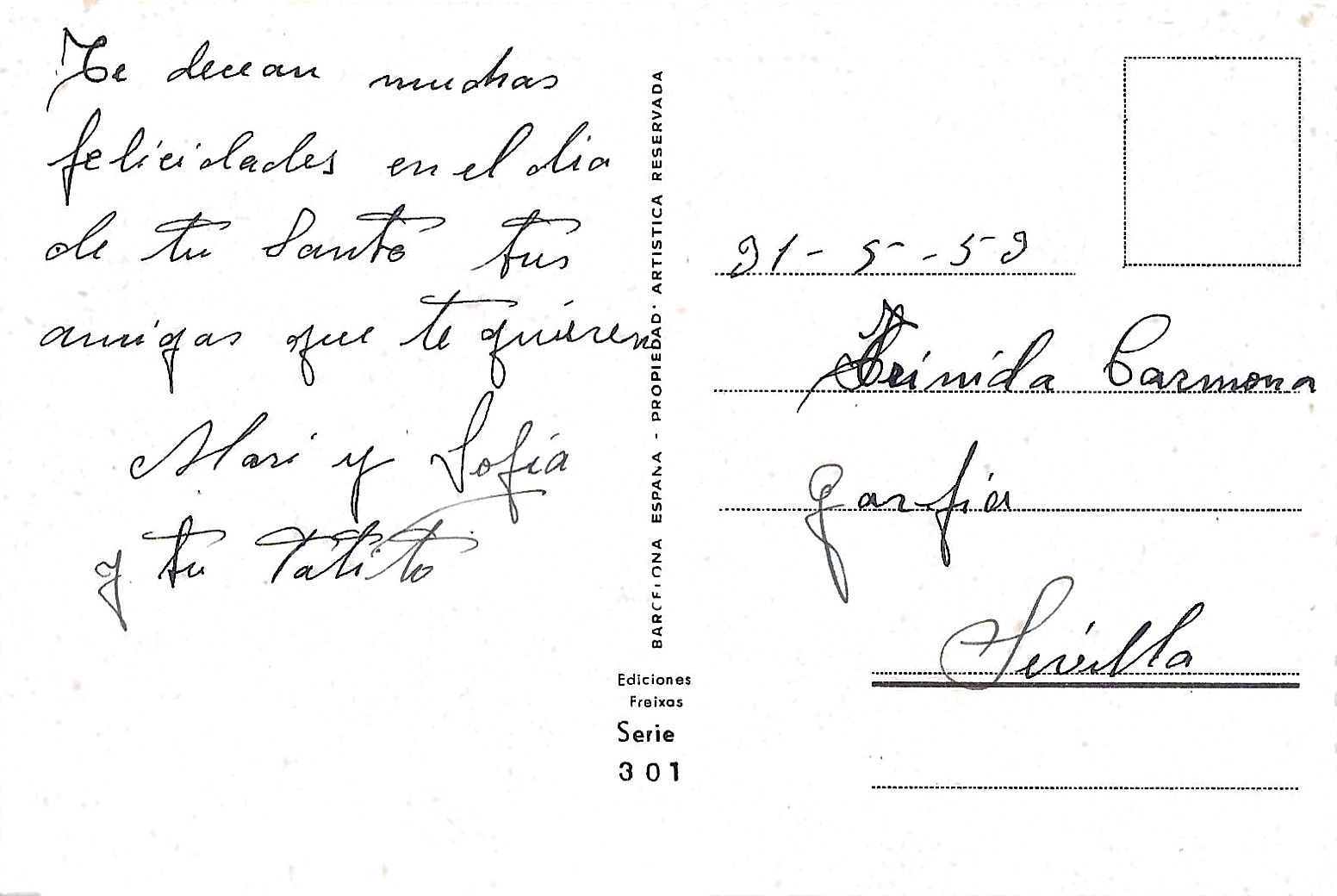 Postal escrita felicitando el Santo al destinatario. De Barcelona a Sevilla el 31 de mayo de 1953.