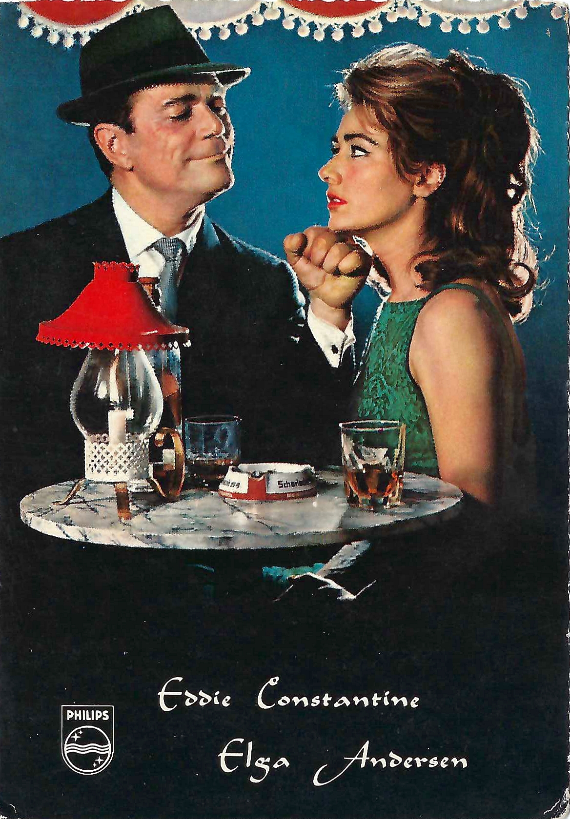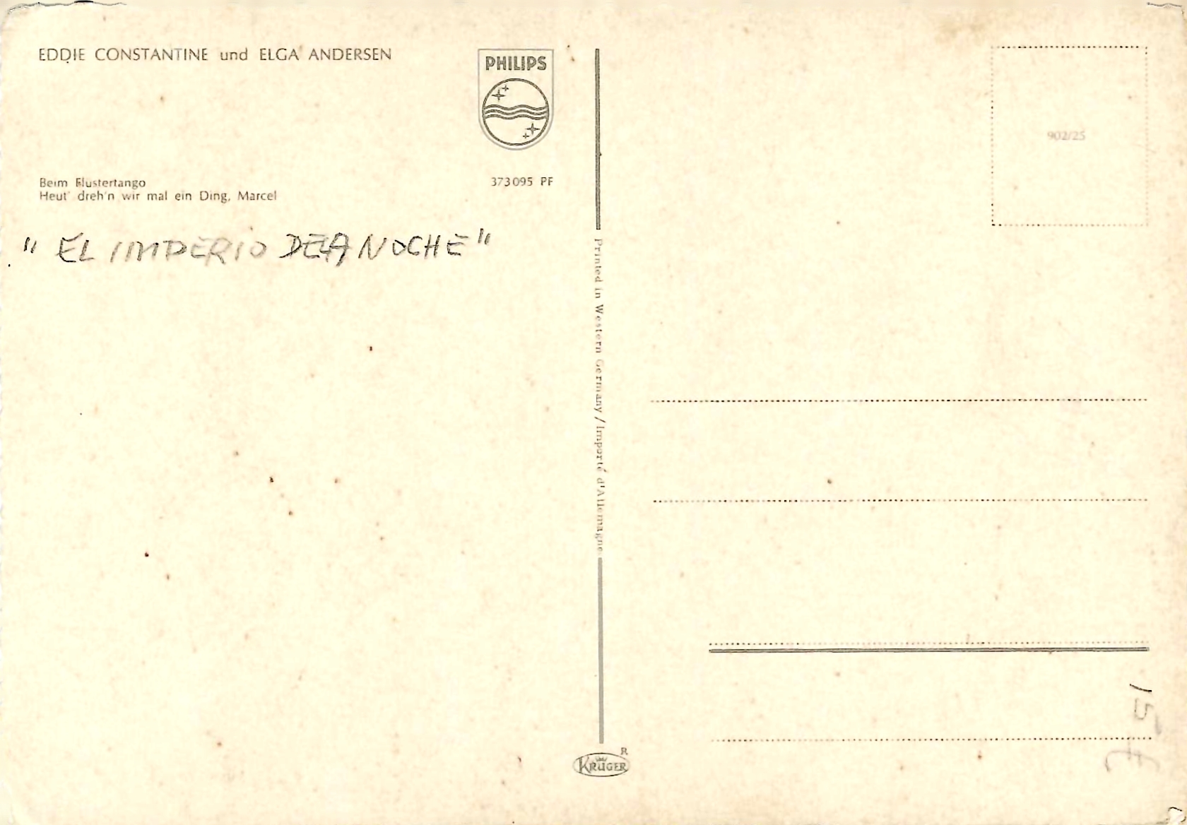 Postal con la imagen de Eddie Constantine y Elga Andersen de la película «El Imperio de la Noche» del año 1951