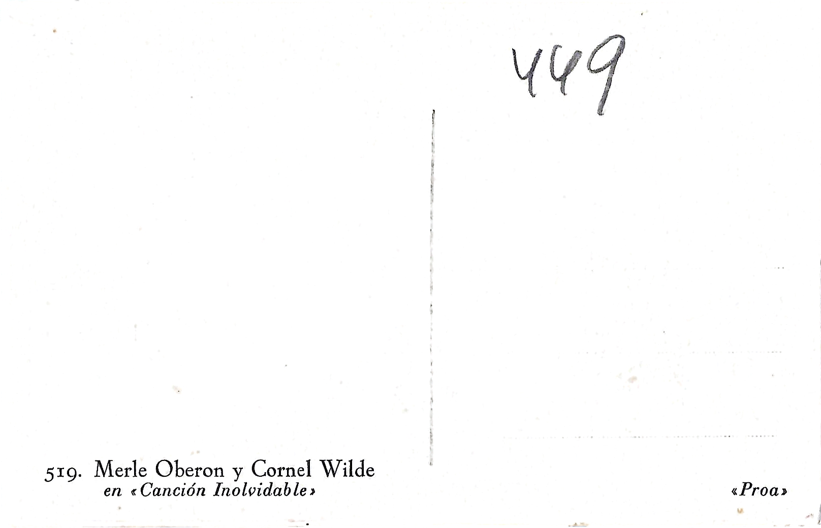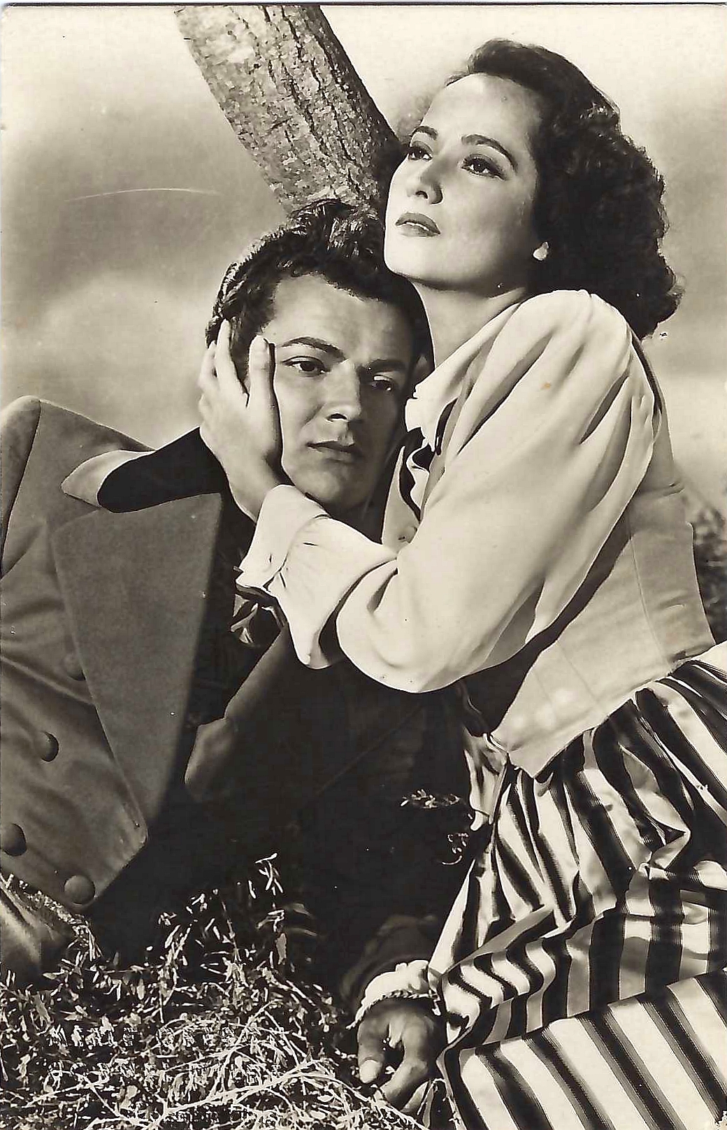 La foto muestra a dos actores, Cornel Wilde y Merle Oberon, en lo que parece ser una toma promocional de una película «Una canción inolvidable» de 1945