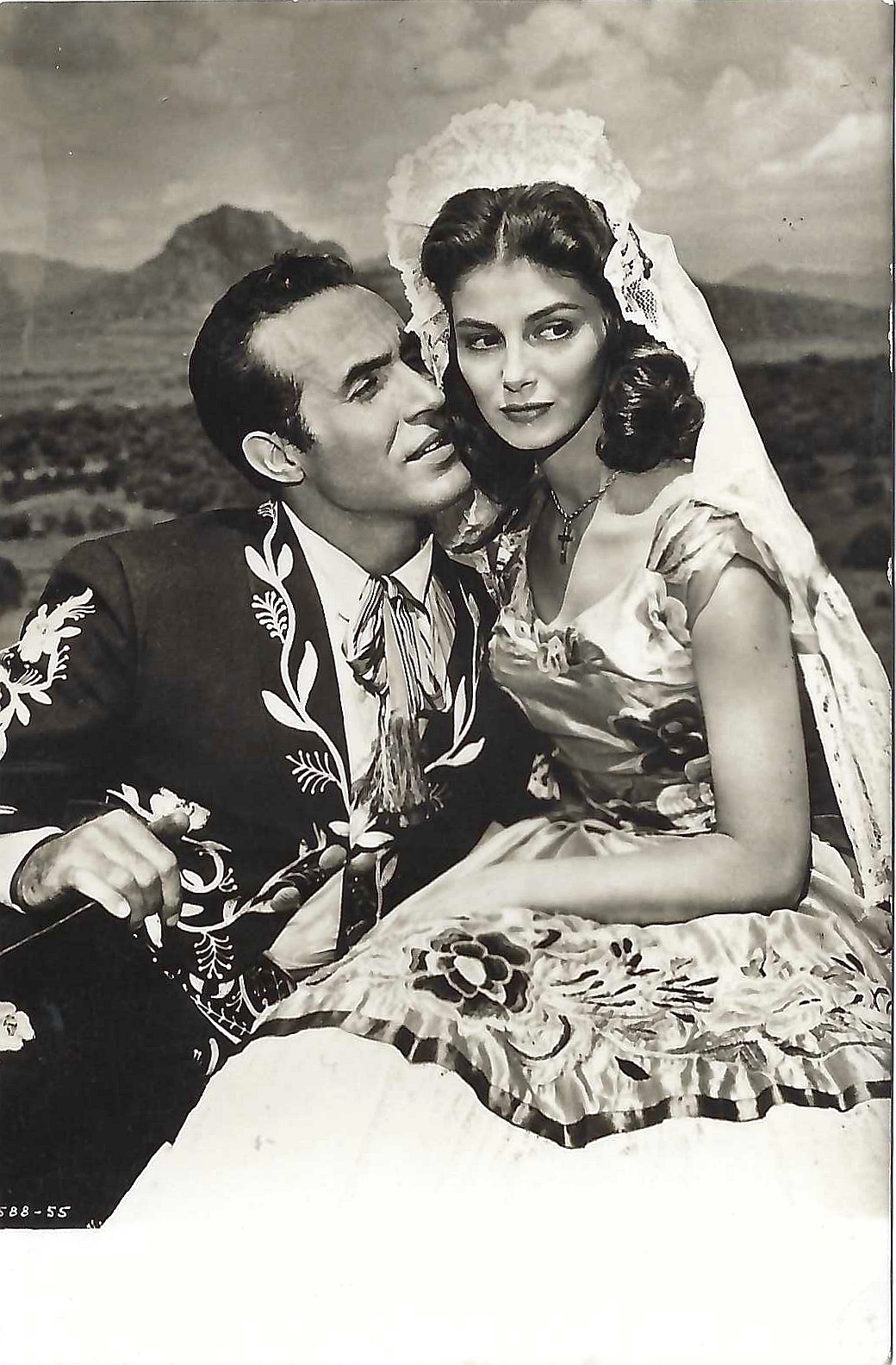 Fotografía en blanco y negro de los actores Pier Angeli y Ricardo Montalbán en la película «Sombrero» de 1953