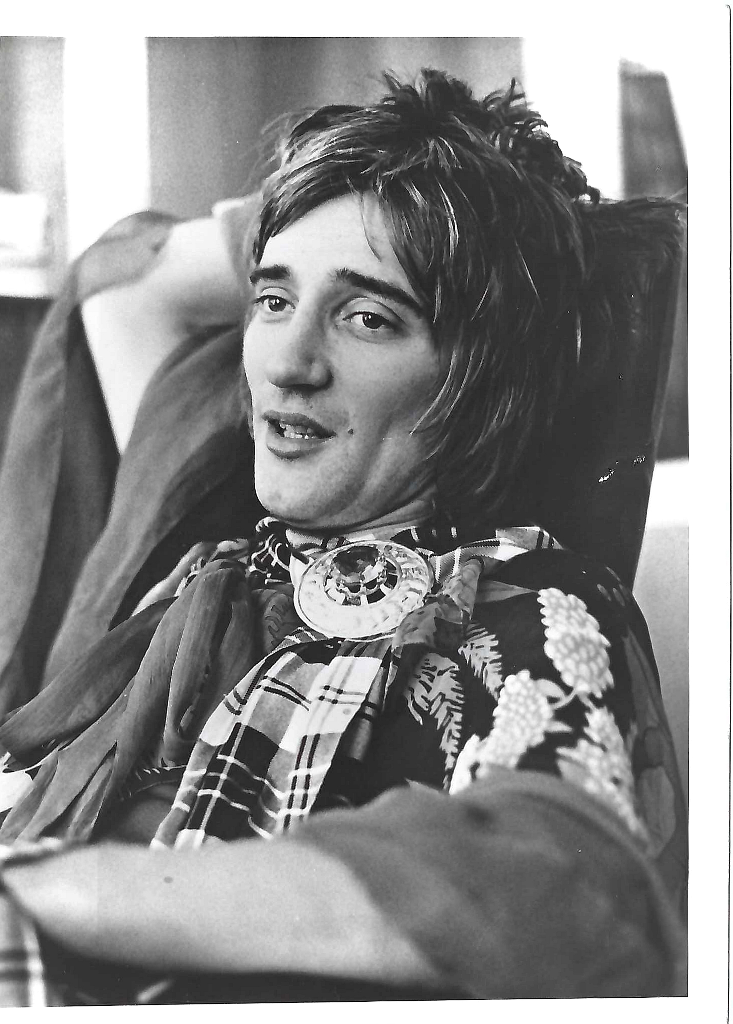 Fotografía en blanco y negro del cantante Rod Stewart en los años 70