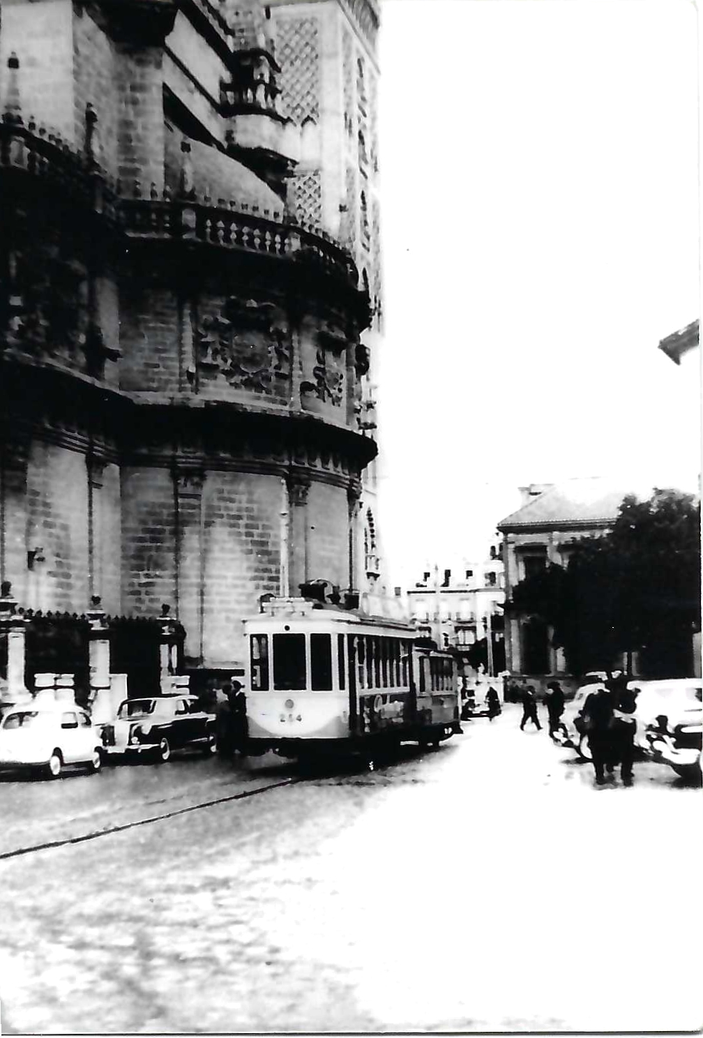 Fotografía en blanco y negro del Tranvía de Sevilla en la zona de la Catedral. Años 60