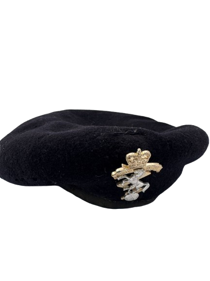 Boina militar de lana en color negro, con distintivo metálico dorado compuesto por una corona y un rayo cruzado.