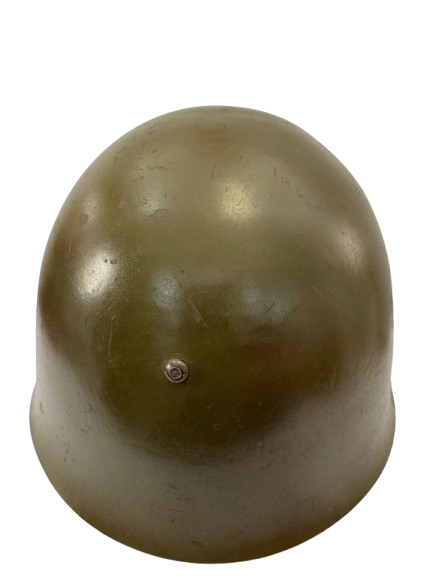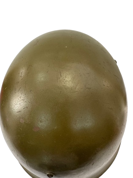 Casco militar fabricado en acero con pintura en color verde oliva.