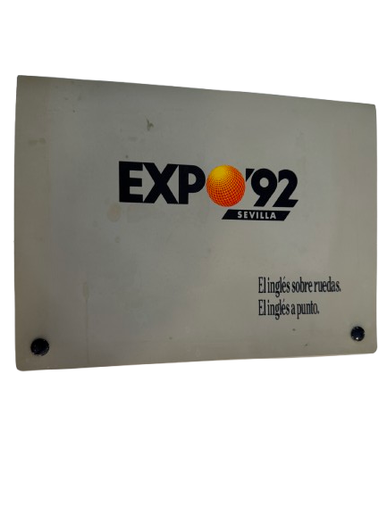 Placa acrílica original de la Exposición Universal de Sevilla 1992, con el logotipo oficial de la Expo y el texto “El Inglés sobre ruedas. El Inglés a punto.” Probablemente usada en una instalación del Pabellón del Reino Unido u otra actividad promocional relacionada con el idioma inglés. Montada con tornillos negros originales en las esquinas. Pieza visual y muy rara para decoración o colección temática.