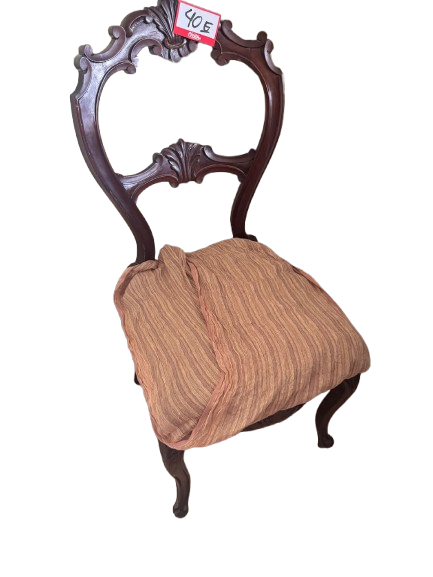 Elegante silla de madera noble tallada, perteneciente al estilo Isabelino (mediados del siglo XIX). Destaca por su respaldo calado en forma de corazón o medallón con una talla superior en forma de concha (rocalla). Las patas delanteras son de tipo «cabriolé» (curvadas).El cliente tendrá que recoger en piso Open House, corriendo por su cargo los gastos