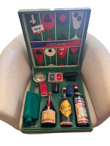 Exclusivo set de juegos promocional de la marca Cinzano, con una estética retro de los años 60/70. El estuche presenta un diseño gráfico llamativo en el interior de la tapa con motivos de naipes y copas.El cliente tendrá que recoger en piso Open House, corriendo por su cargo los gastos.